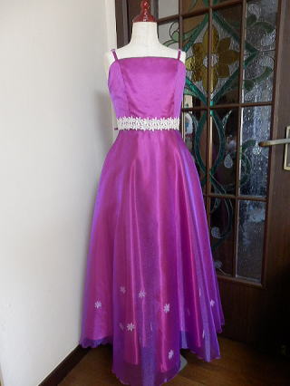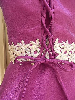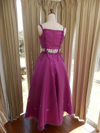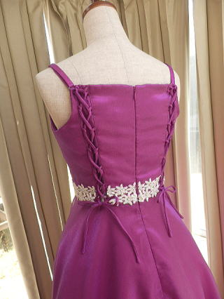 後ろの二本の編み上げと肩紐の調節で、150サイズから、5号、7号サイズまで対応できるドレスです。